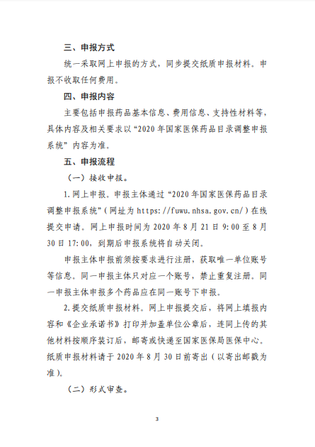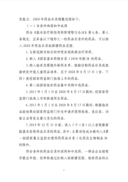 2020年8月3日-10日,国家医疗保障局就《2020年国家医保药品目录调整工作方案(征求意见稿)》向社会公开征求了意见。8月17日,《2020年国家医保药品目录调整工作方案》和《2020年国家医保药品目录调整申报指南》正式公布。